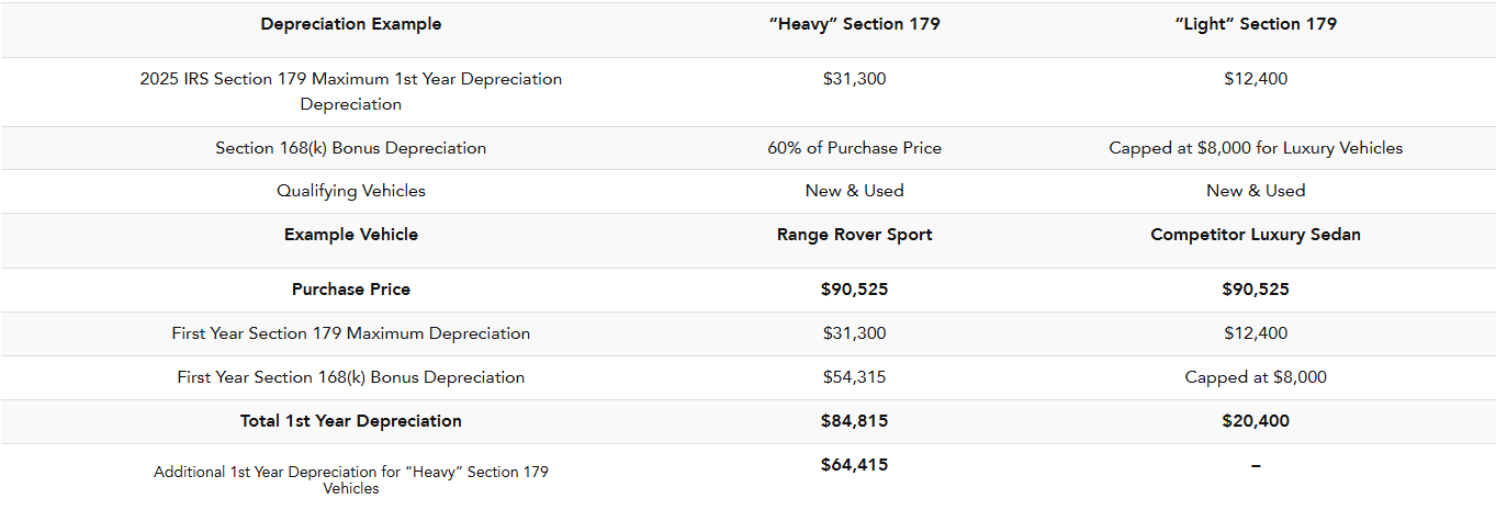 Additionally, Section 168(k) allows for additional "Bonus Depreciation" amounting to 60% of the purchase price of a select Range Rover, Range Rover Sport, Range Rover Evoque, Range Rover Velar, Defender 90, Defender 110, Defender 130, or Discovery through the end of 2025. When added to the $31,300 from Section 179, this can deliver a dramatic first-year depreciation tax deduction for certain luxury SUVs purchased in 2025.